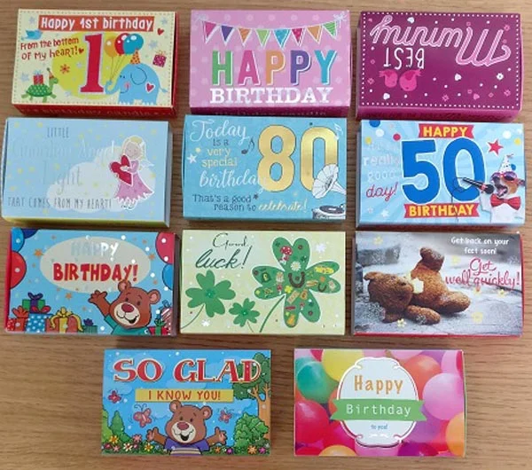 Descriere: Lumânare pastilă atașată la o cutie de carton. Vândute în mod individual. Conține mai multe cutii de carton cu nume diferite: doresc să aibă cea mai bună lumânare, o lumânare pentru aniversare, o lumânare frumoasă, o lumânare norocoasă.