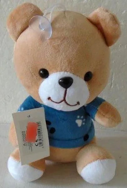 Descriere: Jucărie de culoare maro deschis (ursuleț de pluș), cu un tricou albastru și o cupă de aspirație fixată pe cap. Jucăria este vândută fără ambalaj.