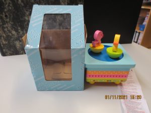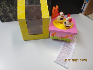 Atașarea la una dintre cleme eșuează, iar piesele mici (marle și inele) pot fi ușor detașate de inelele de lemn. Un copil mic le poate pune în gură și se sufocă. Produsul nu este conform cu cerințele Directivei privind siguranța jucăriilor și nici cu standardul european EN 71-1.