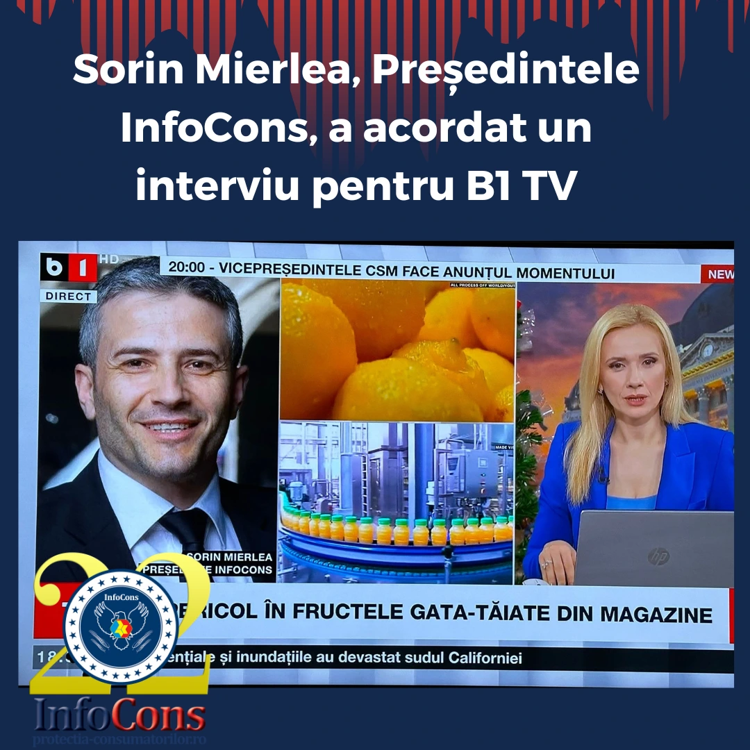 Sorin Mierlea , Președintele InfoCons Protecția Consumatorilor , a acordat un interviu telefonic pentru B1 TV , vorbind despre pericolul din fructele gata tăiate din magazine , dar și despre Aplicația Europeană de Protecția Consumatorilor InfoCons .