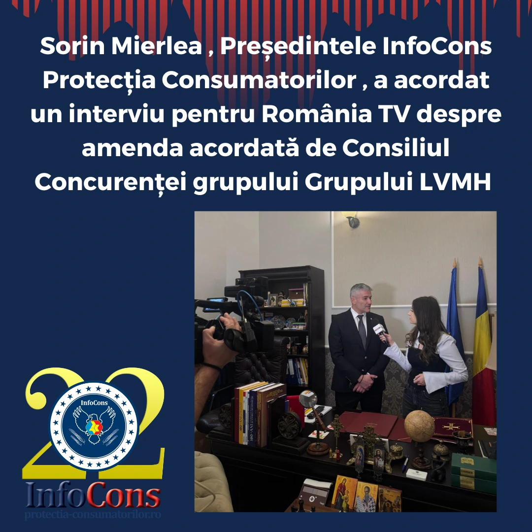 Sorin Mierlea , Președintele InfoCons Protecția Consumatorilor în direct la postul de televiziune România TV , a acordat un interviu pentru România TV despre amenda acordată de Consiliul Concurenței grupului Grupului LVMH ( Louis Vuitton – Moët&Chandon – Hennessy ) , precum și despre Aplicația Europeană Gratuită InfoCons .