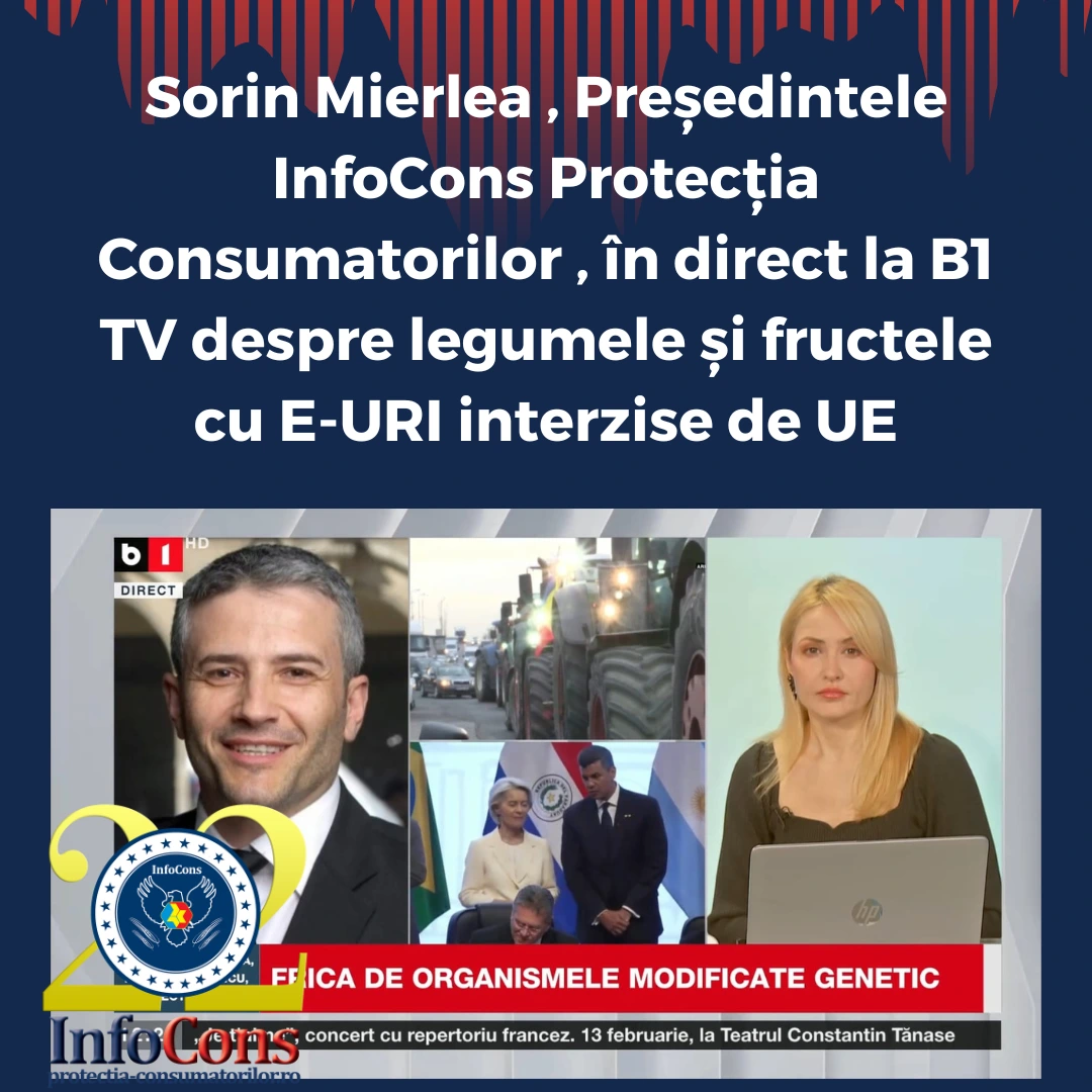 Sorin Mierlea , Președintele InfoCons Protecția Consumatorilor , în direct la B1 TV , vorbind despre legumele și fructele cu E-URI interzise de UE , precum și despre Aplicația Europeană de Protecția Consumatorilor InfoCons .