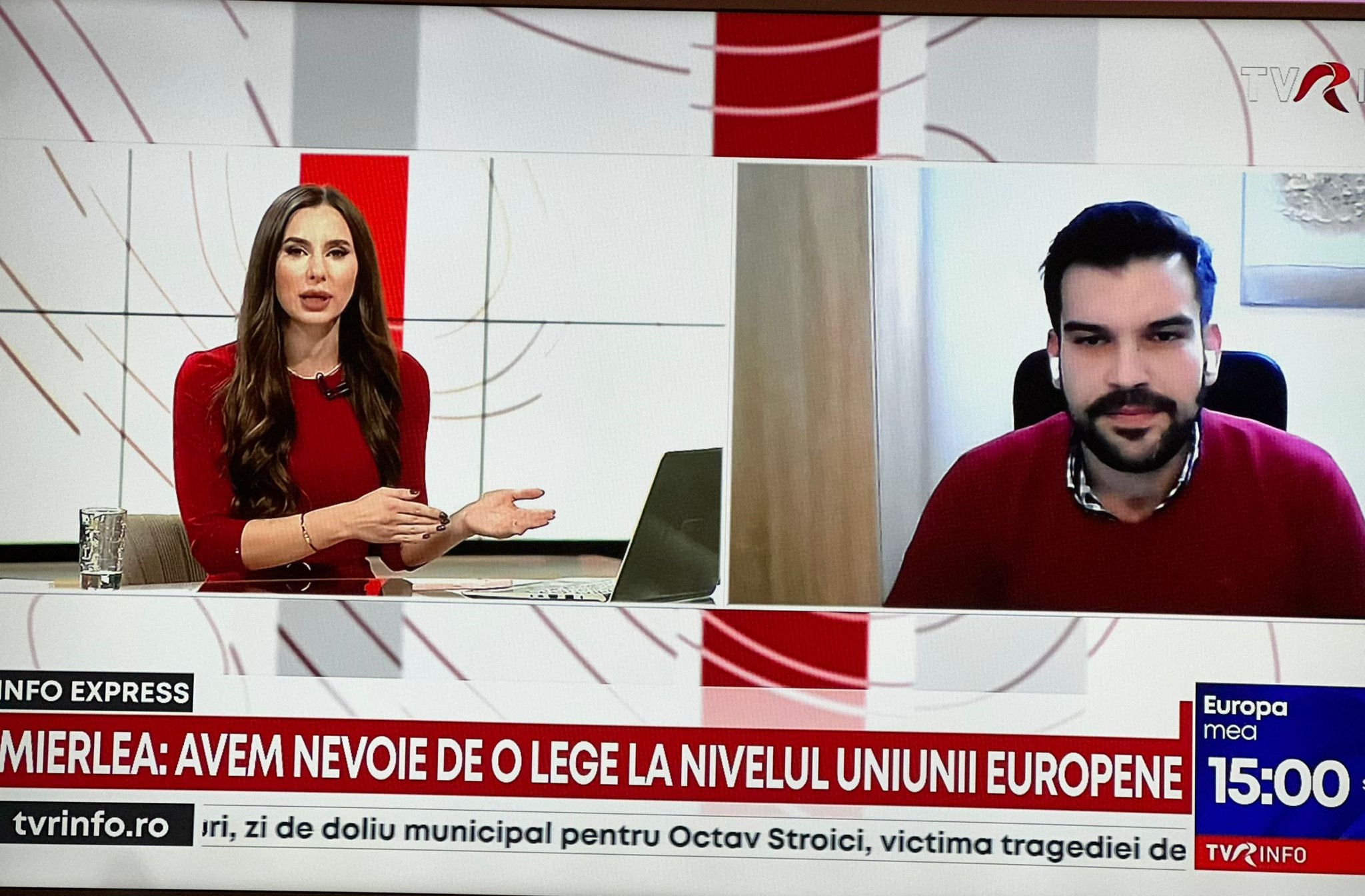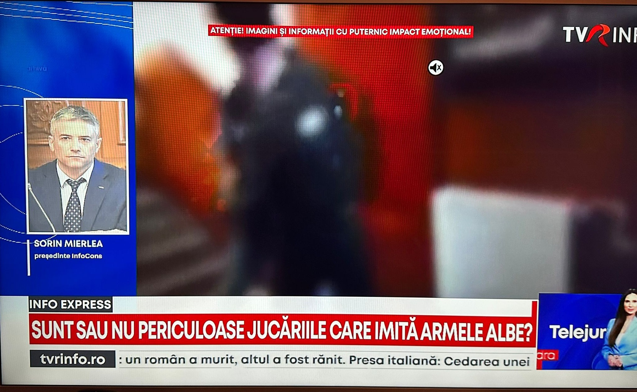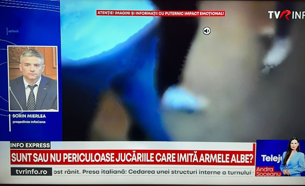 Sorin Mierlea , Președintele InfoCons Protecția Consumatorilor , în direct la TVR Info , în cadrul emisiunii „ Info Express ” , vorbind despre jucăriile care imită armele albe destinate copiilor mici și despre Aplicația Europeană Gratuită InfoCons .