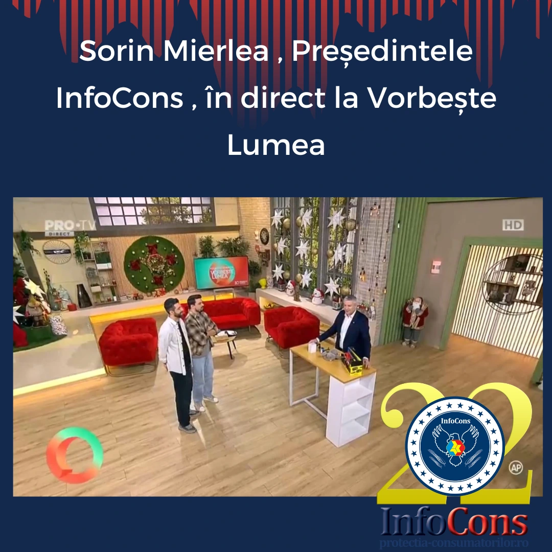 Sorin Mierlea , Președintele InfoCons , este în direct la Vorbește lumea , de la Pro TV , vorbind despre alertele la cadourile de Crăciun pentru adulți și copii , precum și despre Aplicația Europeană InfoCons .