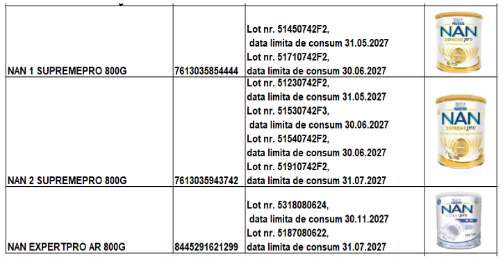 Ca măsură de precauție, Nestlé România recheamă voluntar o cantitate limitată din formulele de lapte cu datele de identificare menționate în anexă. Siguranța și bunăstarea sugarilor reprezintă prioritatea noastră absolută.