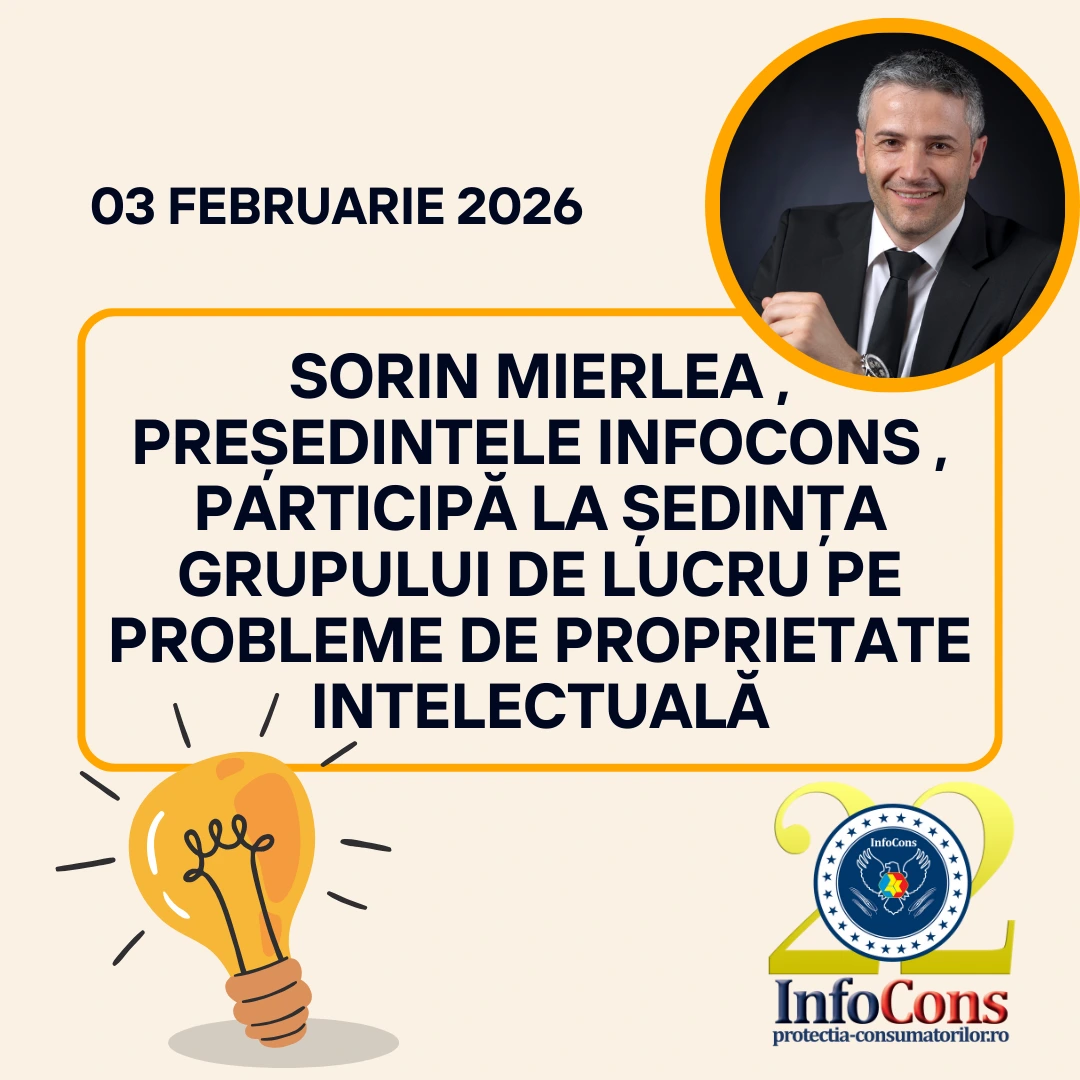 Sorin Mierlea , Președintele InfoCons participă la întâlnirea Grupului de lucru pe Probleme de Proprietate Intelectuală astăzi , 03 Februarie 2026 , începând cu ora 10:00 .