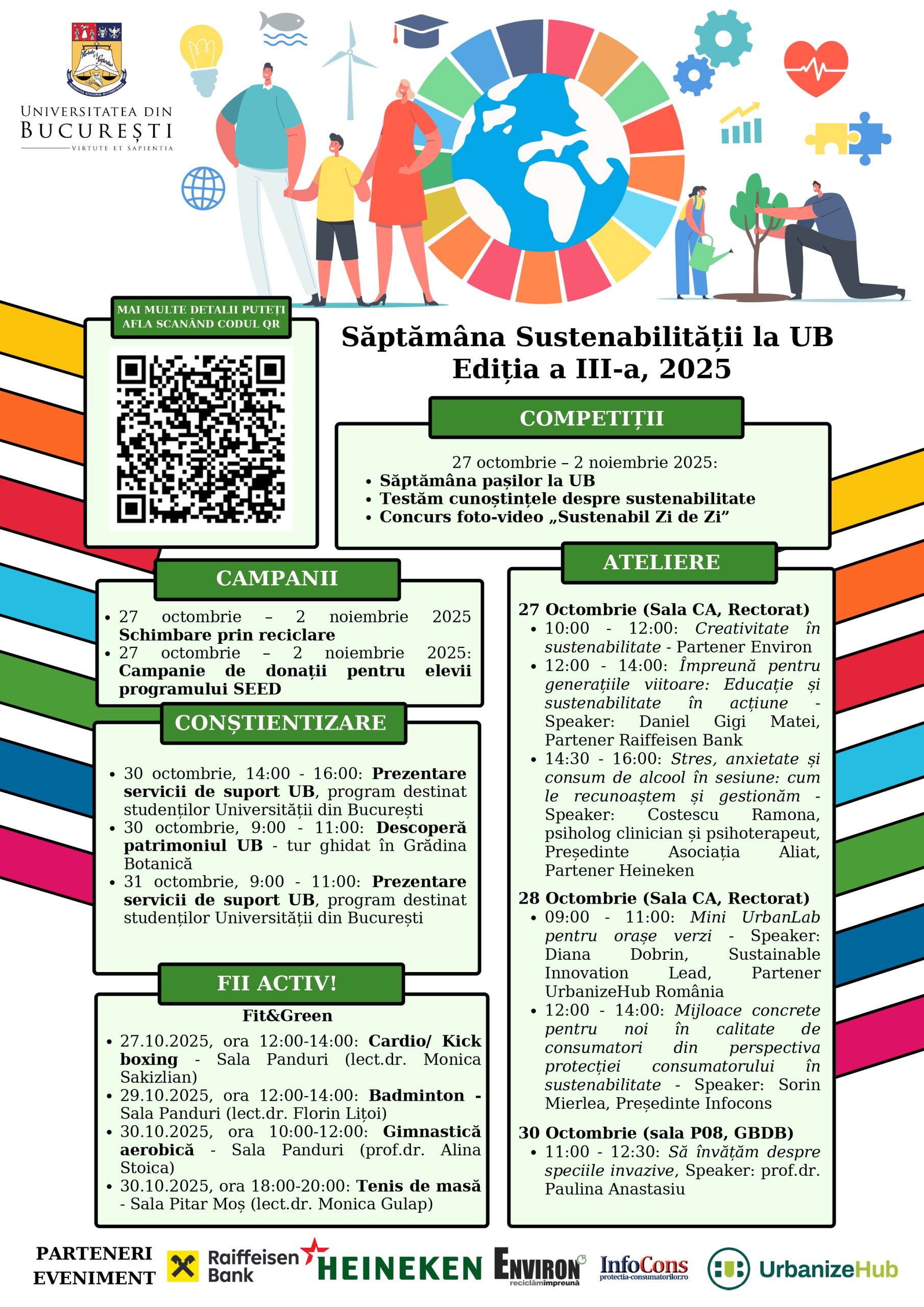 InfoCons este partener în cadrul celei de-a treia ediție a Săptămânii Sustenabilității la Universitatea din București care este organizată în perioada 27 octombrie 2025 – 2 noiembrie 2025.