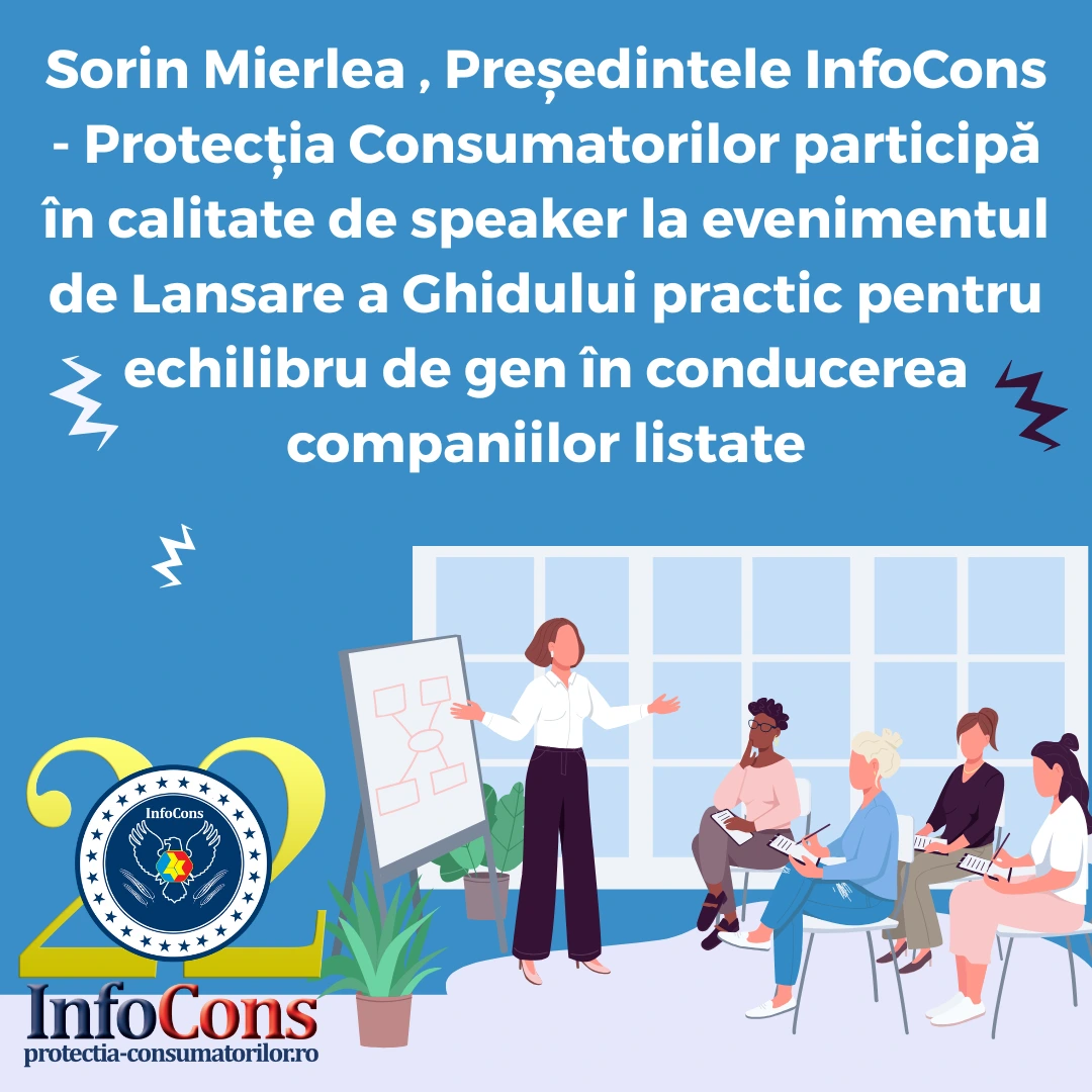 Sorin Mierlea , Președintele InfoCons – Protecția Consumatorilor participă astăzi , 6 Mai 2025 , în calitate de speaker la evenimentul de Lansare a Ghidului practic pentru echilibru de gen în conducerea companiilor listate .