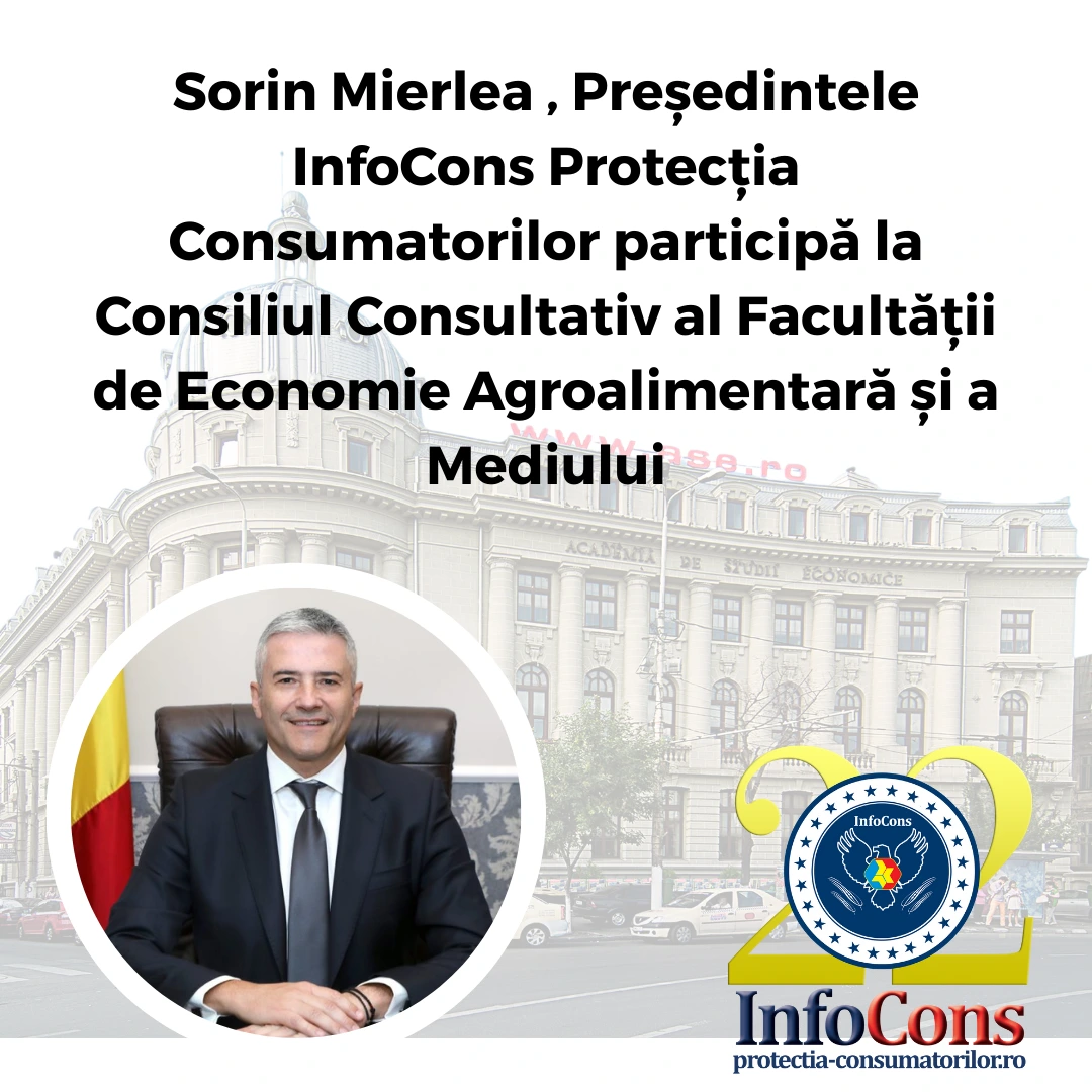 Sorin Mierlea , Președintele InfoCons Protecția Consumatorilor participă astăzi , 29 Ianuarie 2026 , începând cu orele 15:00 , la Consiliul Consultativ al Facultății de Economie Agroalimentară și a Mediului .