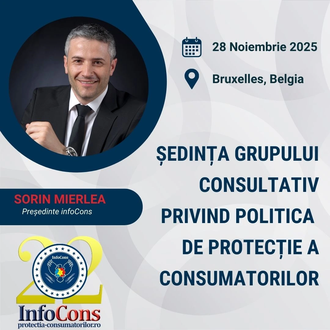 În data de 28 Noiembrie 2025, Sorin Mierlea, Președintele InfoCons, participă la ședința Grupului Consultativ privind Politica de Protecție a Consumatorilor, organizată la Bruxelles, Belgia .