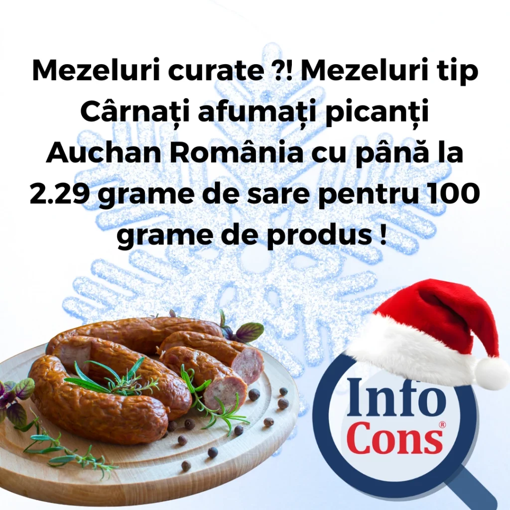Mezeluri curate ?! Mezeluri tip Cârnați afumați picanți Auchan România cu până la 2.29 grame de sare pentru 100 grame de produs ! Adăugat la: 2026-01-04