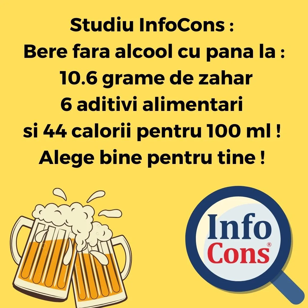 Studiu InfoCons protectia consumatorilor : Bere fara alcool cu pana la 10.6 grame de zahar , 6 aditivi alimentari / 6 E-uri si 44 calorii pentru 100 ml! Alege bine pentru tine !
