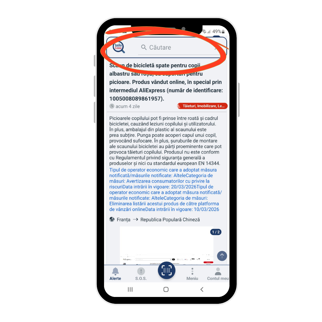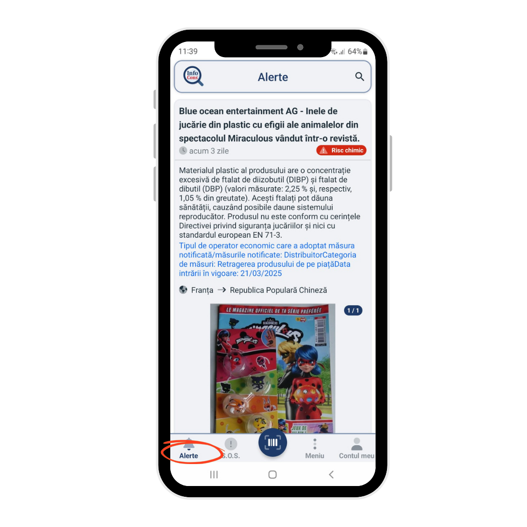 Pentru verificarea unui produs in baza de date a Aplicatiei InfoCons , daca acesta se afla intr-o ALERTA de neconformitate, accesati sectiunea ALERTE din meniul Aplicatiei InfoCons .